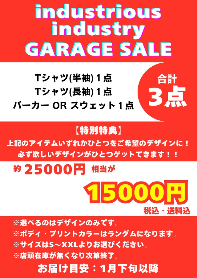 店頭在庫2点にお好きなデザインのアイテムを1点プラスしてお届け! ①半袖TEE 1点 ②長袖TEE 1点 ③スウェットまたはパーカー 1点 合計3点で約25000円相当が15000円で送料無料! うち1点はお好きなデザインのアイテムが必ずゲットできます!! ご希望のデザインはカスタムオーダーページのメインデザインをご参照ください。 【カスタムオーダーページのリンクはこちら】 https://industrious.official.ec/p/00004 ⚠️ご購入前にご確認をお願いします!⚠️ ※ご注文のタイミングによってはお届けまでにお時間をいただく場合がございます。 ※特別特典で選べるのはメインデザインのみです。ボディやプリントするインクのカラーはランダムになります。 ※サイズはS〜XXLよりお選び下さい。 ※限定デザインは対象外です。 ※フリーサイズのアイテムが入る場合があります。 ※返品・交換はできません。 ※在庫が無くなり次第終了とさせていただきます。