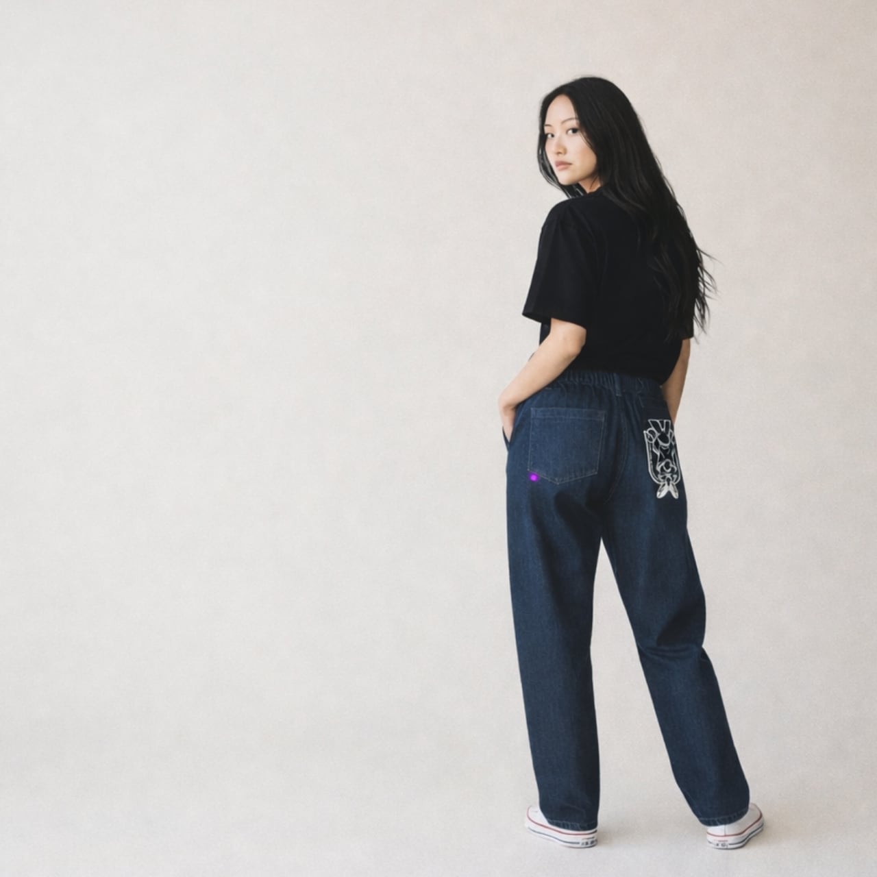 ストレッチデニムで動きを妨げず、テーパードシルエット。